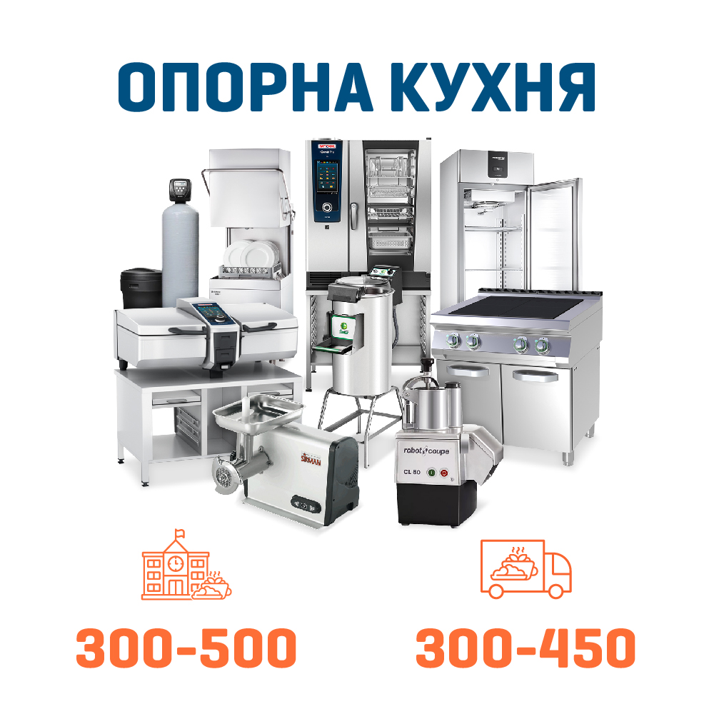 Набір “Опорна кухня” передбачає забезпечення харчуванням як свого закладу освіти, так і додатково інших прилеглих закладів, що складений відповідно до рекомендацій регулюючих органів. Комплект включає основне обладнання для приготування, зберігання, обробки продуктів, розраховане на 300-500 учнів, а також забезпечує доставку страв для 300-450 учнів.